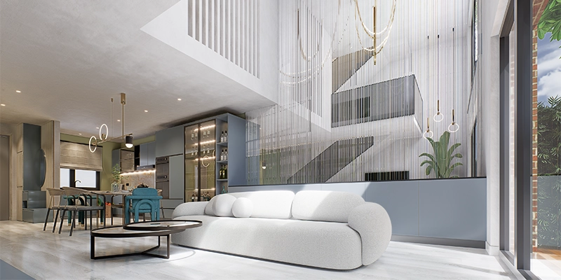Lumina naturală și iluminatul artificial bine plasat creează senzația de spațiu deschis. Lămpile suspendate, benzi LED și oglinzile ajută la maximizarea percepției de dimensiune.